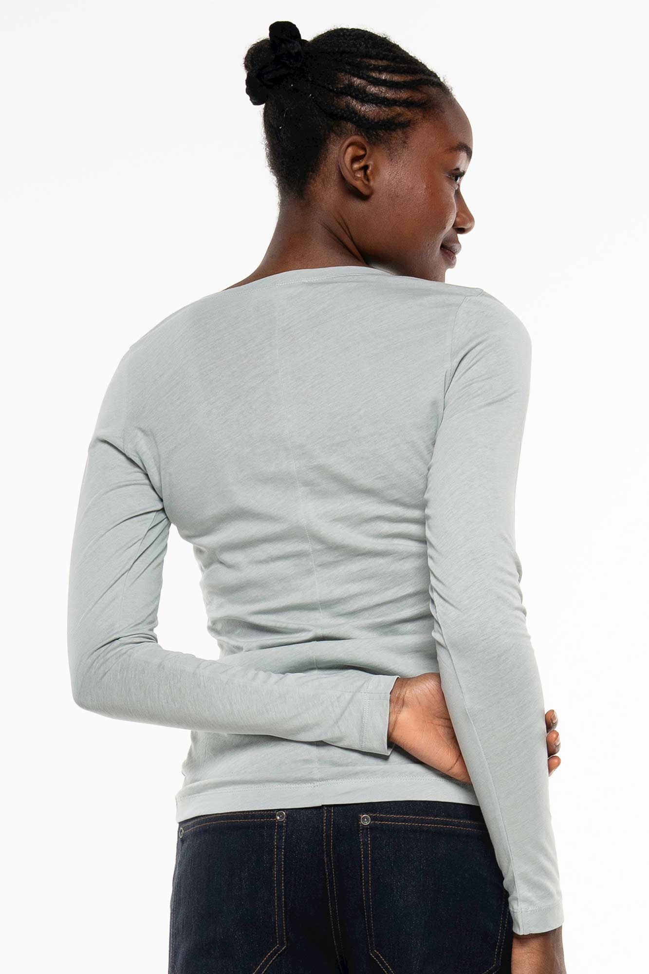 Alma & Lovis Pure Shirt Longsleeve opal. Dieses Basic Langarmshirt aus einem anschmiegsamem feinen Bio-Baumwoll-Jersey garantiert dir absolutes Wohlgefühl. Der Schnitt ist schmal und lang, das gilt auch für die Ärmel! Es ist als klassisches Basic entworfen und entsprechend vielseitig kannst du es auch tragen: zum Blazer, zur Jeans, zum Rock oder in der kalten Jahreshälfte auch als Unterziehshirt.