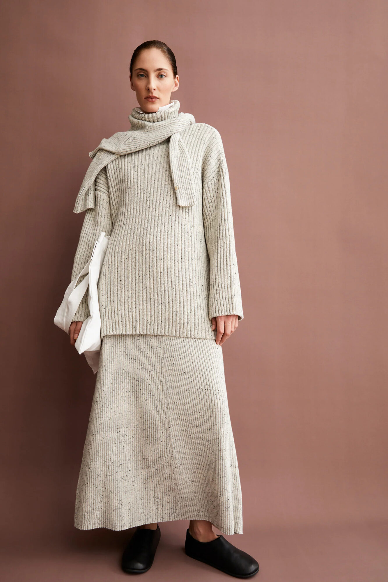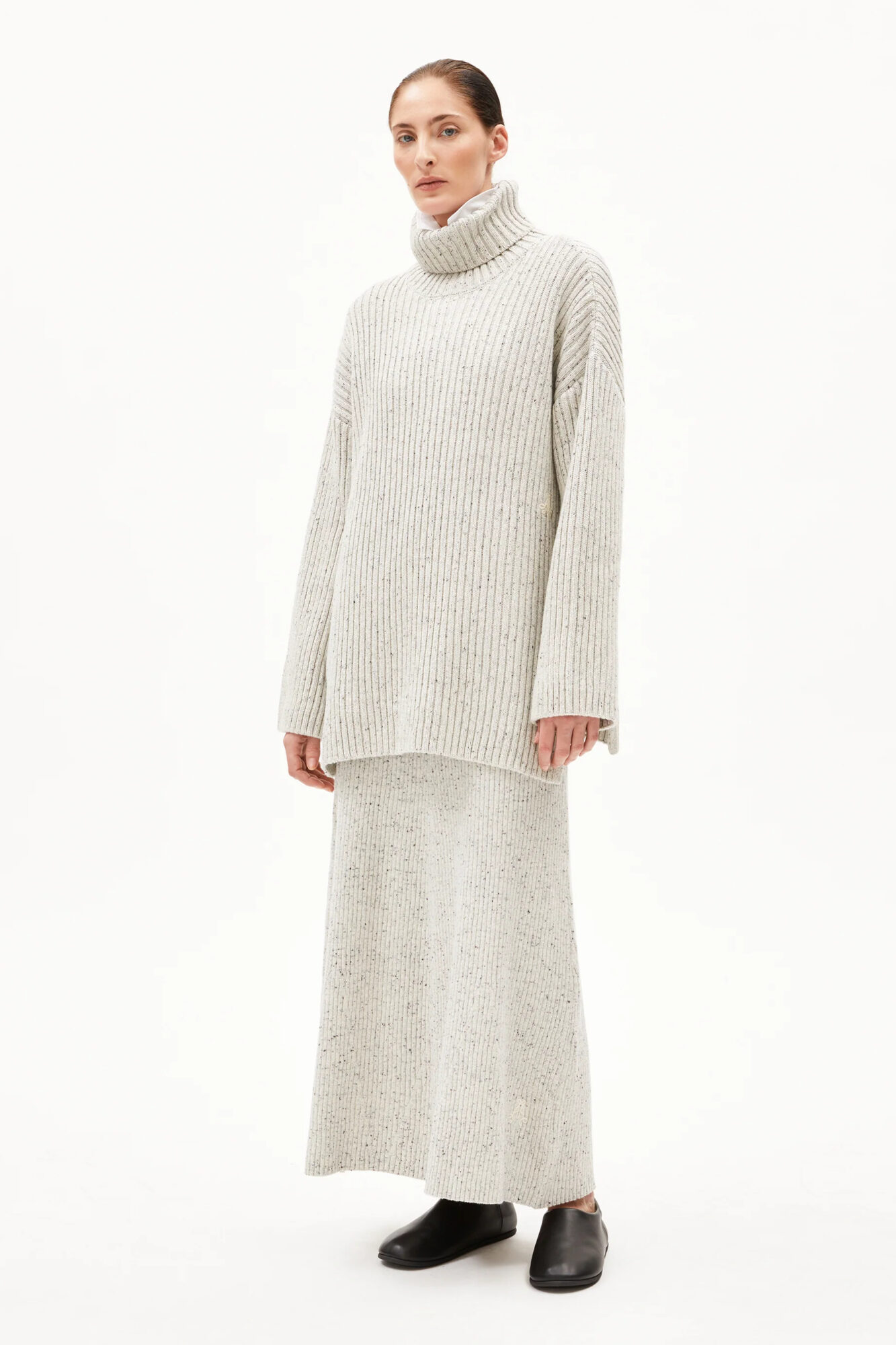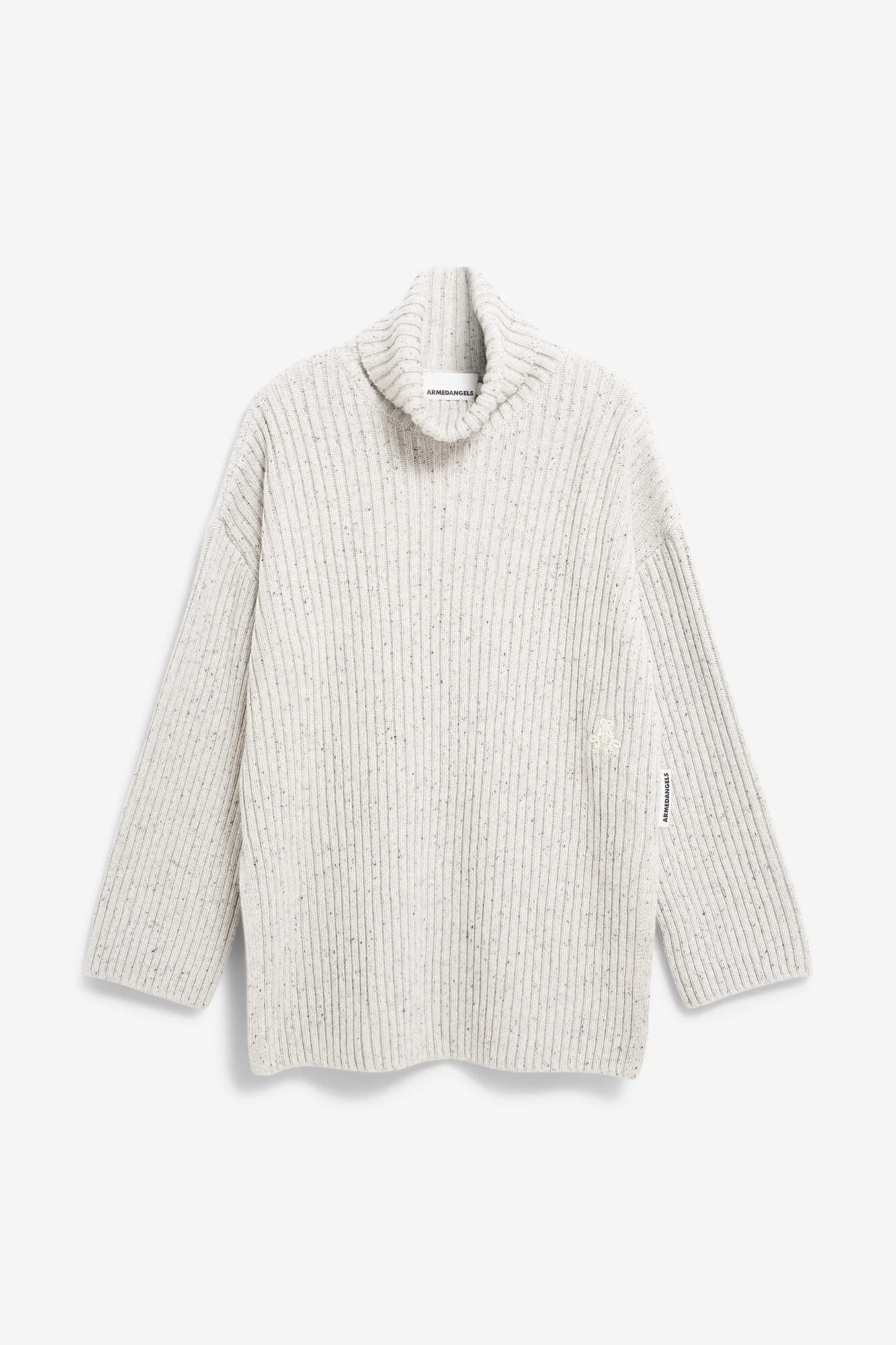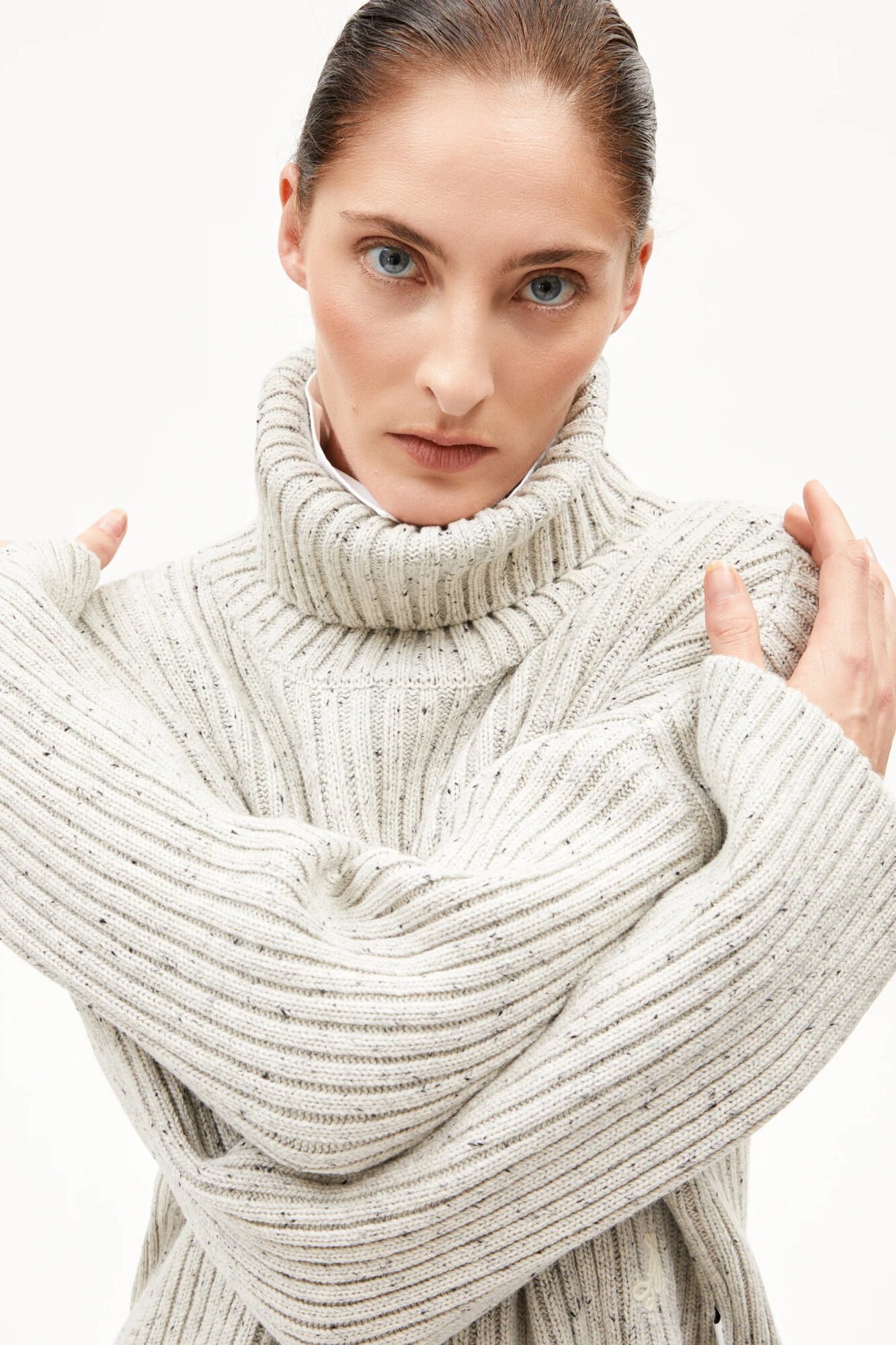 Armedangels Pullover Sabiraa tweed oatmilk-black. Großzügig geschnittener Pulli in dickem Mouliné-Grobstrick. Der Rollkragen ergänzt das entspannte Design, während der Materialmix aus Bio-Baumwolle und recycelter Wolle für angenehme Wärme sorgt. Der Pulli ist extra lang und hat hohe Schlitze an der Seite. Die Rippen sorgen für eine gute Struktur und der zarte Farbton passt zu fast allem.