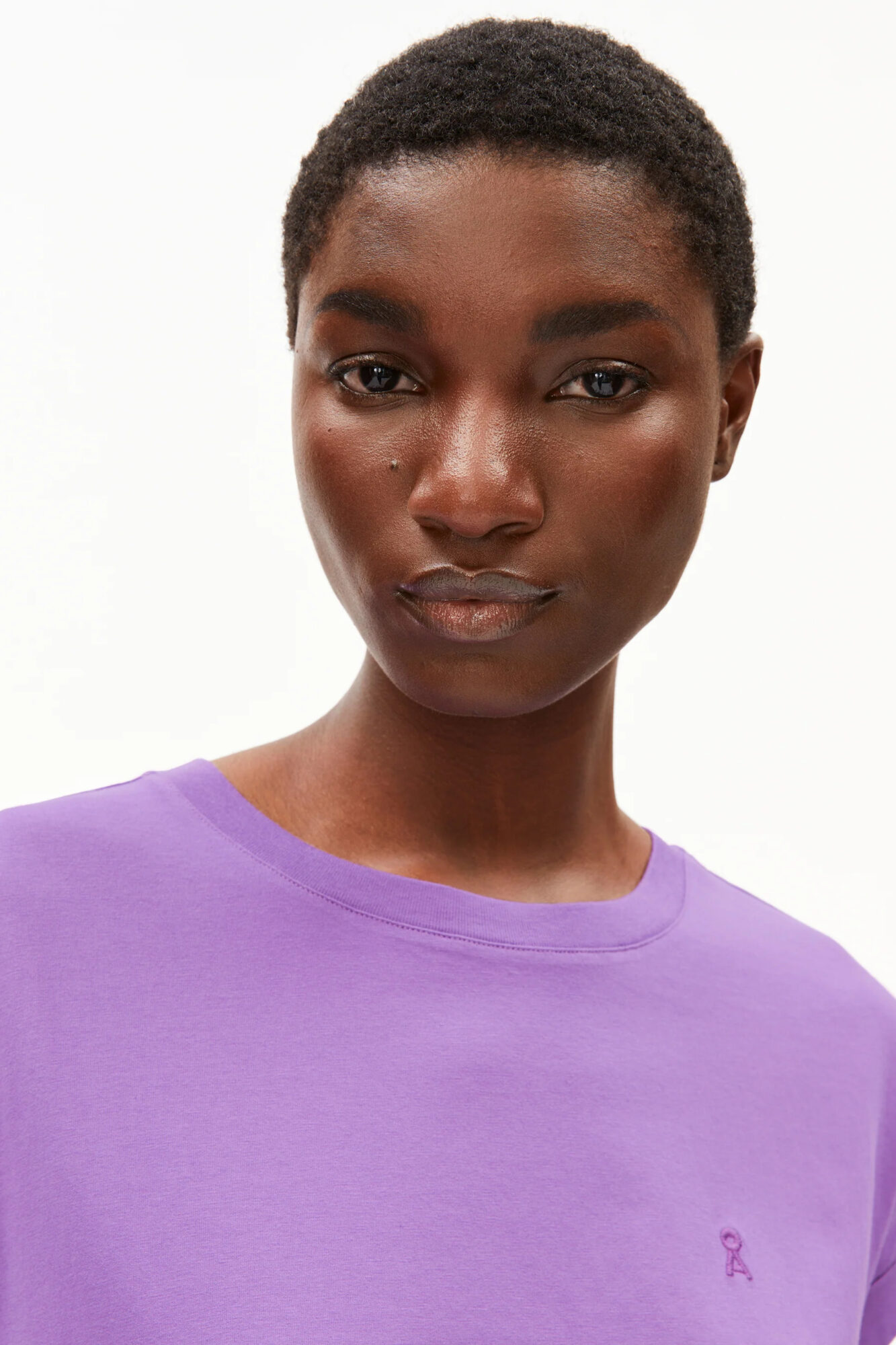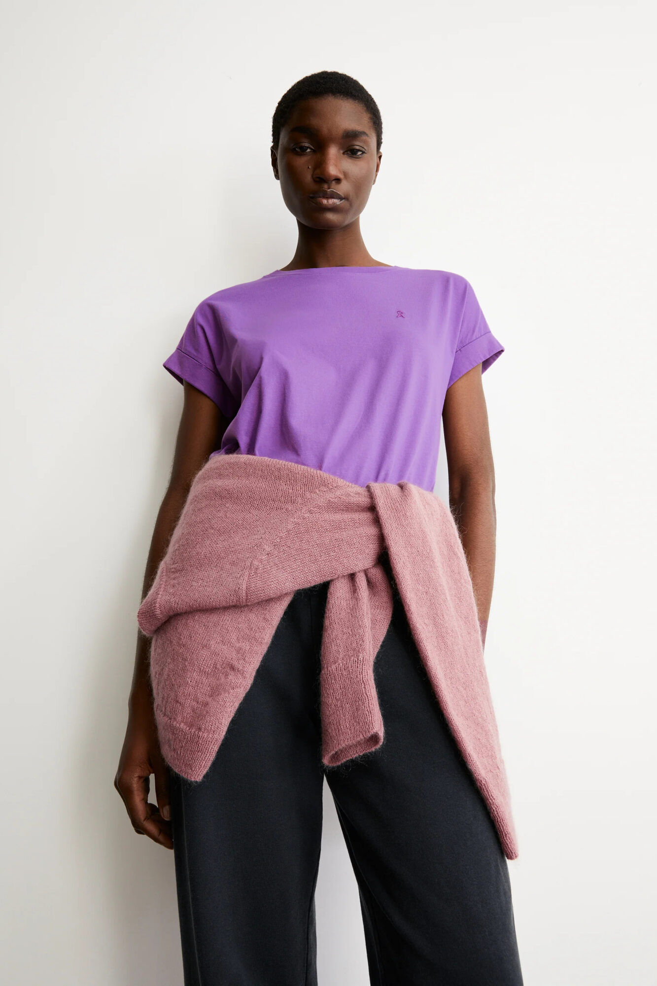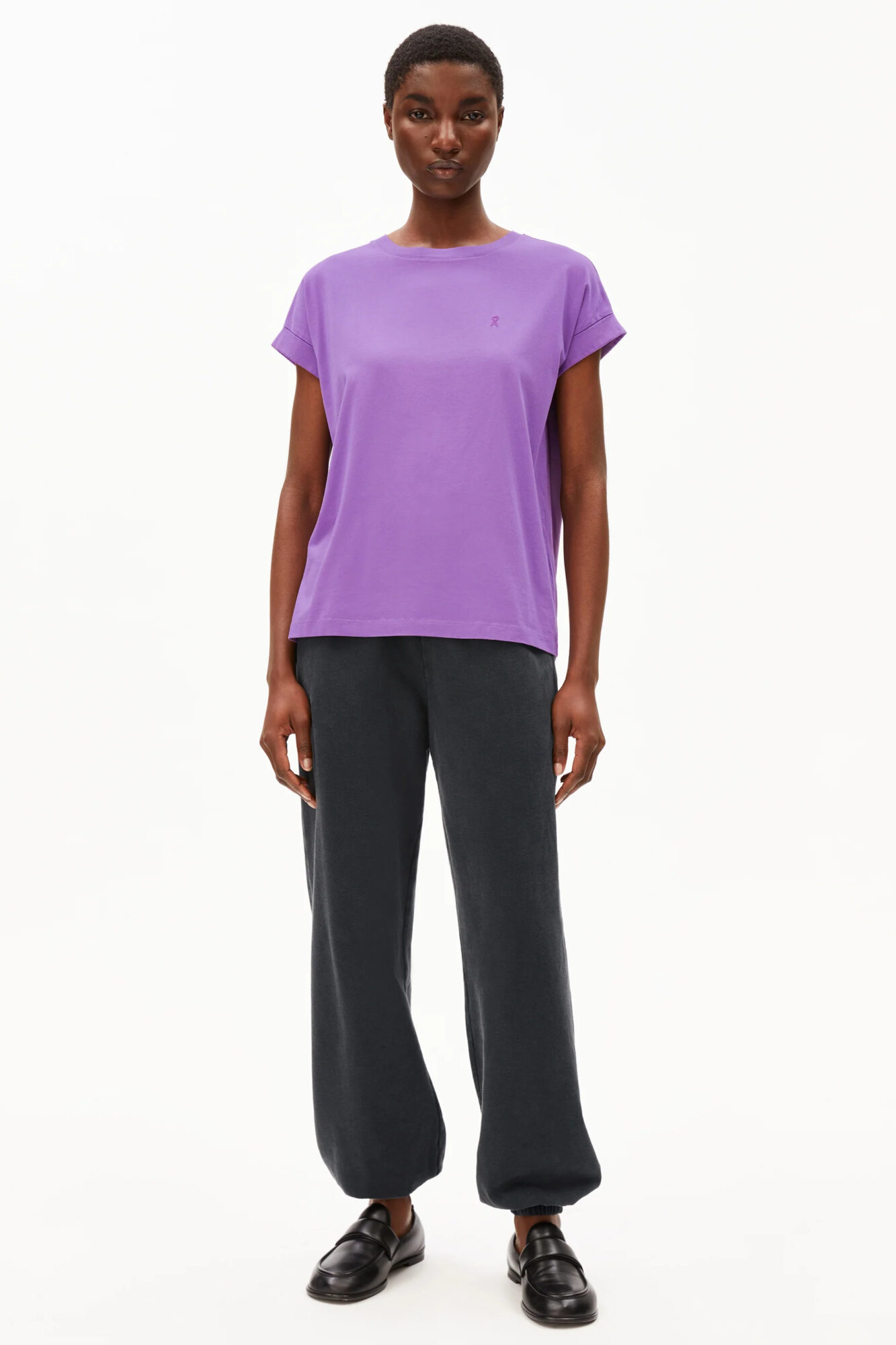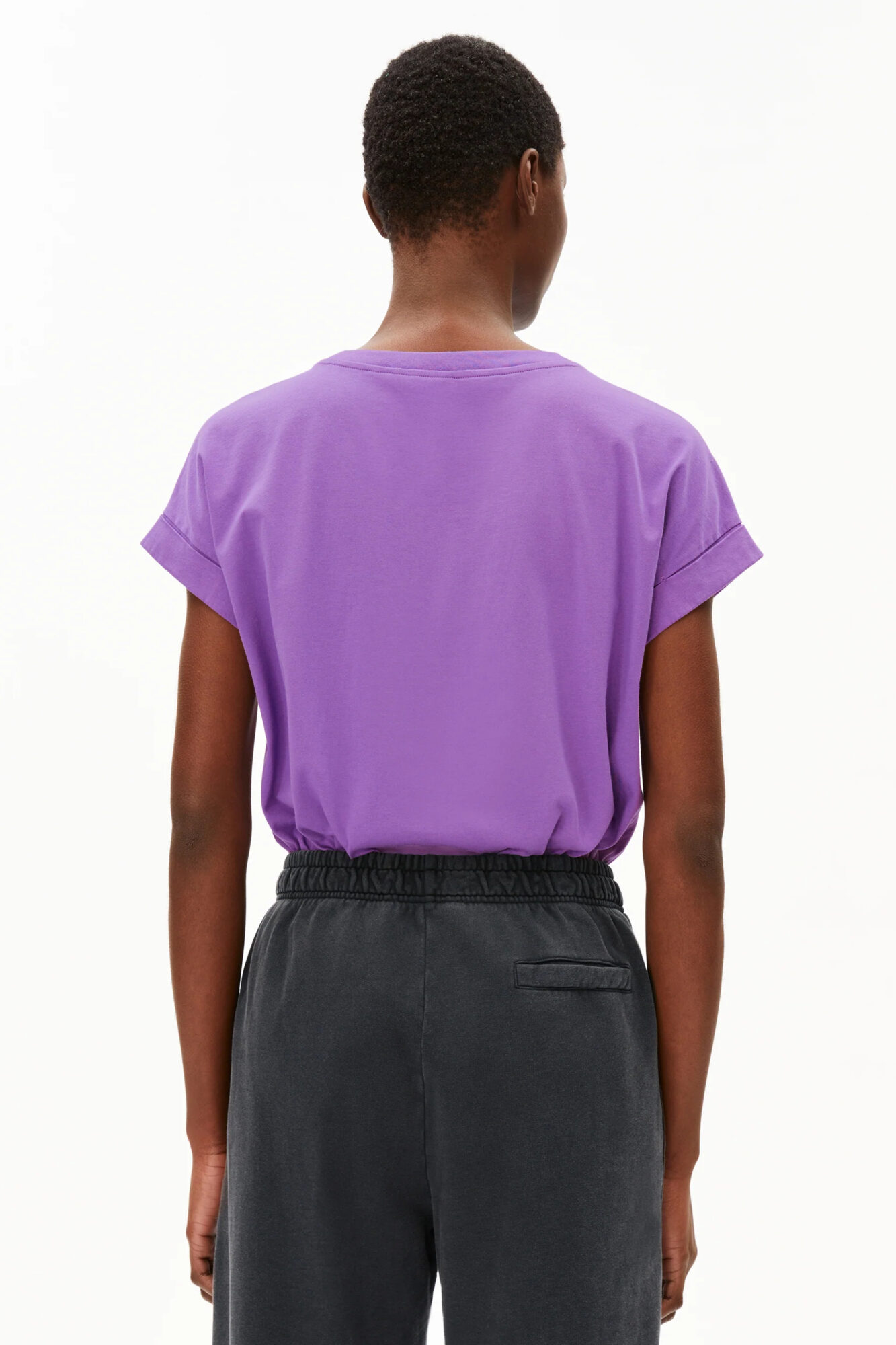 Loose Fit T-Shirt in leuchtendem Lila aus 100% Bio-Baumwolle. Mit kleinem Umschlag am Arm. Vegan.