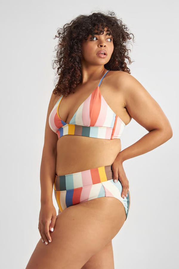 Dedicated Bikini Top Alva stripes multi color. Dieses Triangel-Bikini-Top lieben wir! Im coolen Streifen-Look und mit tiefem V-Ausschnitt, lässt es dich strahlen. Das Top hat einen breiten Unterbrustband für einen sicheren Halt. Die Cups haben herausnehmbare Pads und bieten einen super Support. Dank der Schnürung im Rücken, lässt sich das Top ideal an deinen Körper anpassen. Kombiniere es mit der high-Waist Bikinihose für den perfekten Strandtag.