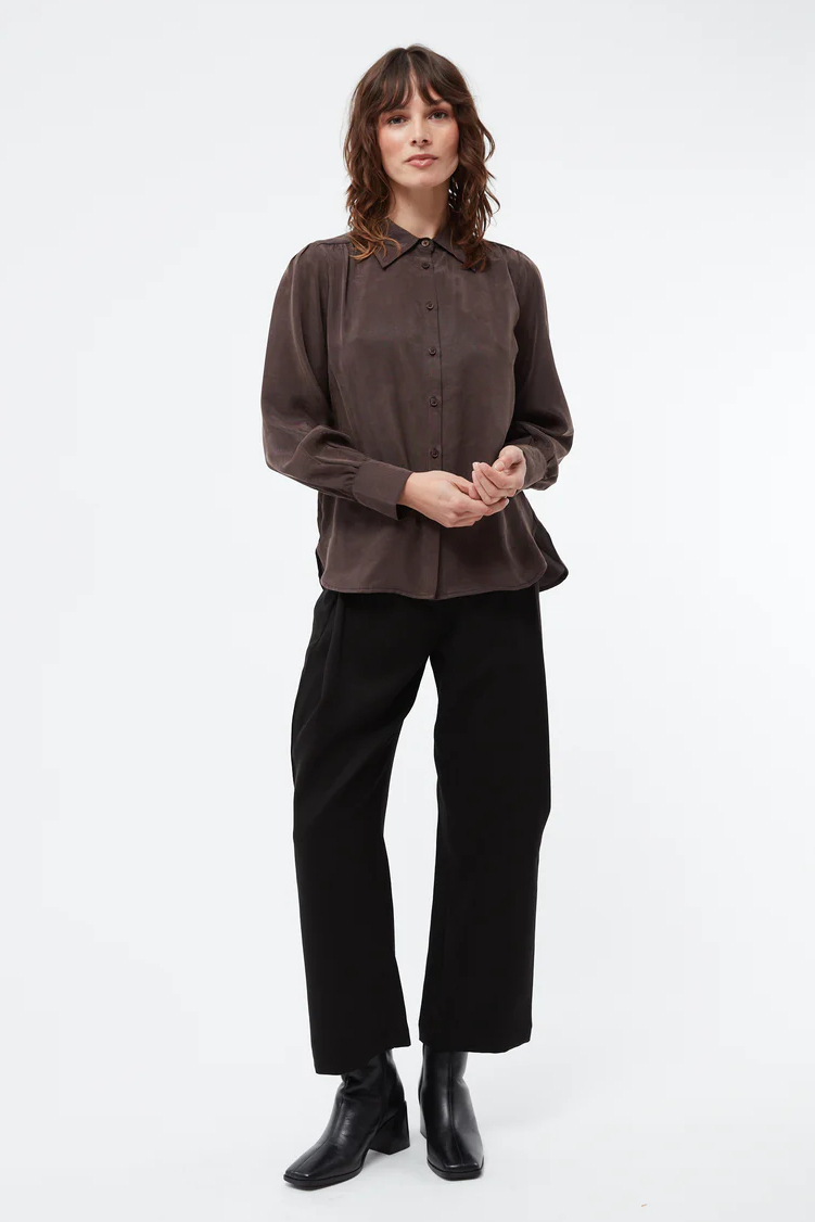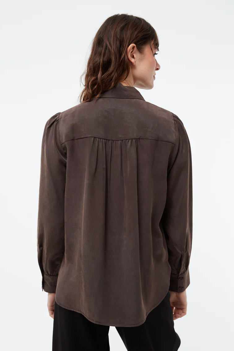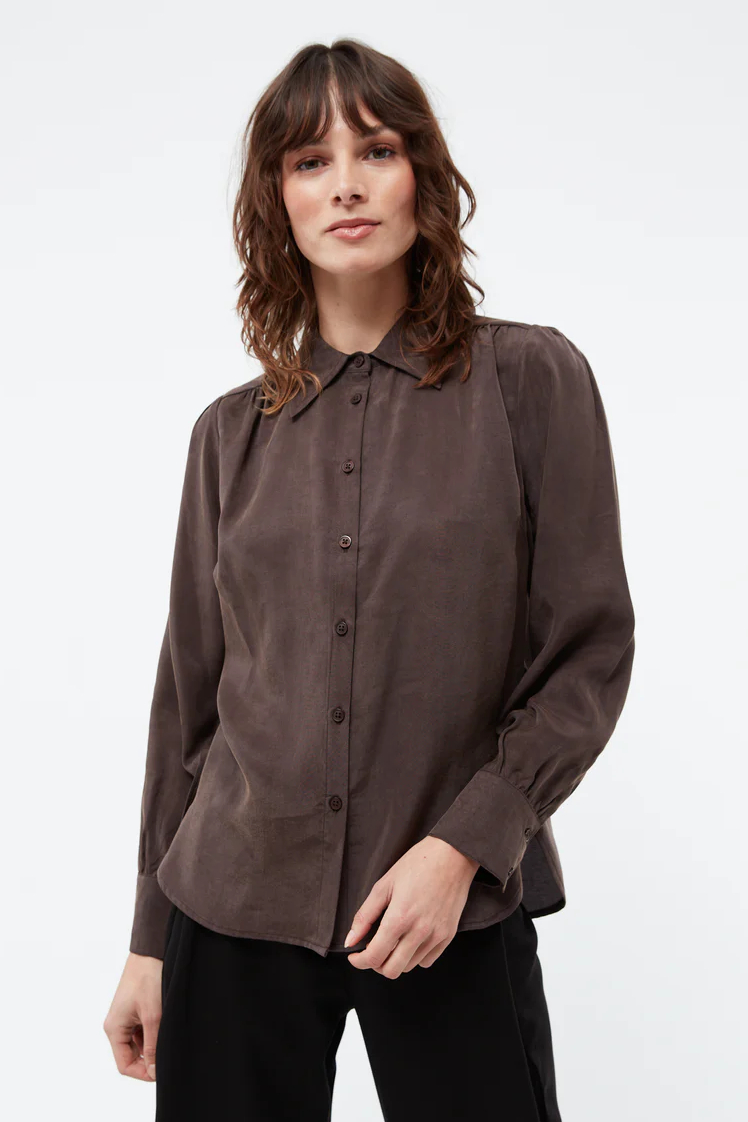 Givn Bluse Kasia coffee brown. Eine feminine, weich fallende Bluse aus Tencel. Die verspielten Details, wie die Puffärmel und die Raffung am Rückenteil machen die Bluse zu einem einzigartigen Highlight. Leicht tailliert formt, die Bluse, eine wunderschöne Silhouette und lässt sich zu jeder Gelegenheit tragen. Kombiniere sie für die Date Night elegant oder lässig mit Sneaker.