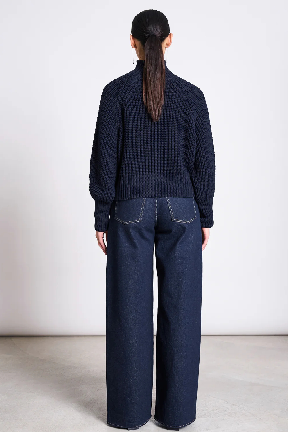 Grobstrick Pulli aus Baumwolle. Cropped und mit Stehkragen, in Navy.